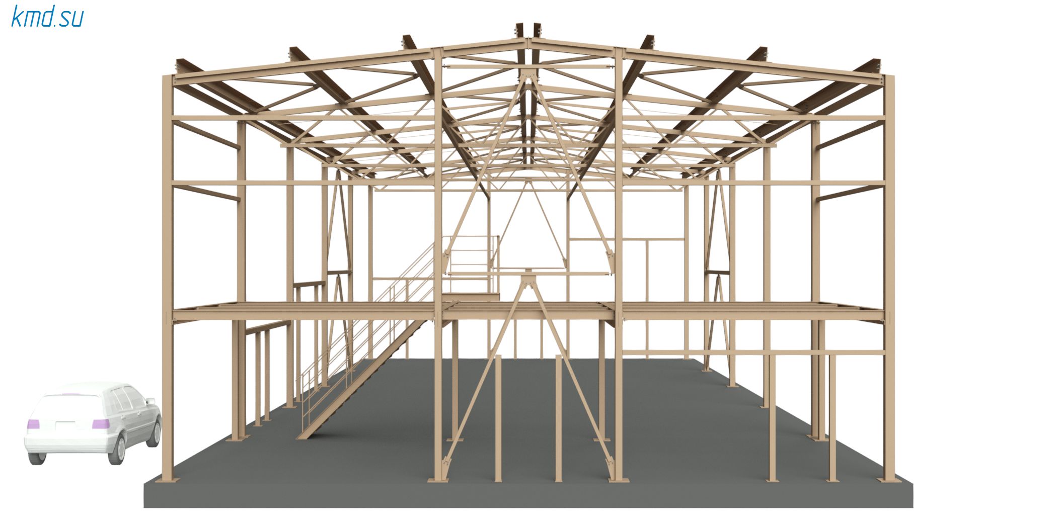 - Прогоны, лестница из гнутого швеллера — выходит дешевле чем прокатный, но габарит немного выше. Фермы самые оптимальные по типу «Молодечно», колонны, связи из профильной трубы. Балки перекрытия покрытия — из двутавра.
