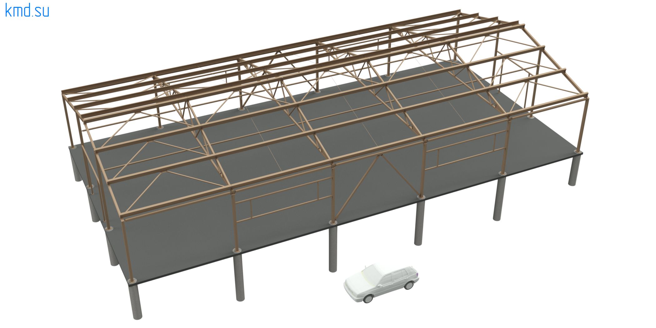 - Рамно связевой каркас, жесткость поперек здания обеспечиваться за счет жесткой заделки колонн в основание — те наличие капитальных анкерных болтов. Вдоль — за счет системы распорок по колонном. Геометрическая неизменяемость покрытия — также обеспечивают раскосы по верхнему поясу фермы, а также затяжки по нижнему.