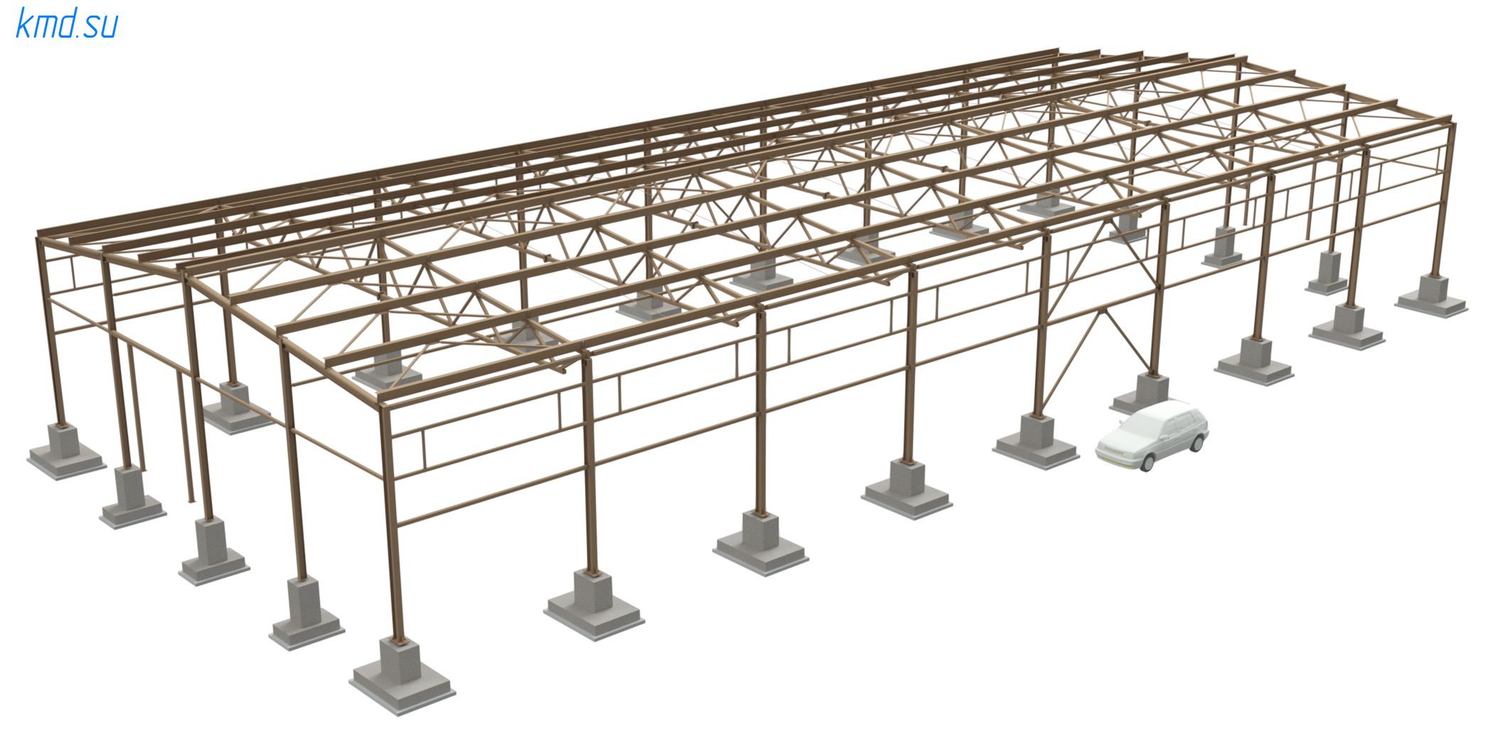 - Рамно связевой каркас, жесткость поперек здания обеспечиваться за счет жесткой заделки колонн в основание — те наличие капитальных анкерных болтов. Вдоль — за счет системы распорок по колонном. Геометрическая неизменяемость покрытия — также обеспечивают раскосы по верхнему поясу фермы, а также затяжки по нижнему.